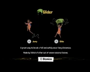 The Glider is an item available in Tchia. It is given to Tchia as a gift by Joxu. The Glider lets Tchia travel long distances depending on how close she is to the ground. It is also useful in breaking falls when jumping off tall objects like a building or cliff, preventing Tchia from passing out and waking up at the nearest Campfire. As with Climbing, the Glider uses Stamina once deployed. Should Stamina reach zero while using the Glider, Tchia's will be given the option to use an emergency glider. Doing so will cause some of her Stamina to be restored in order to give a chance to reach the ground safely. If the Stamina meter run out again, Tchia will fall to the ground and pass out. Because of this, it can be beneficial to only deploy the Glider when close to the ground so as to not waste Stamina. The appearance of the Glider can be customized at Campfires. As with other cosmetics, different Glider skins are obtained through Valuables Chests around the map.